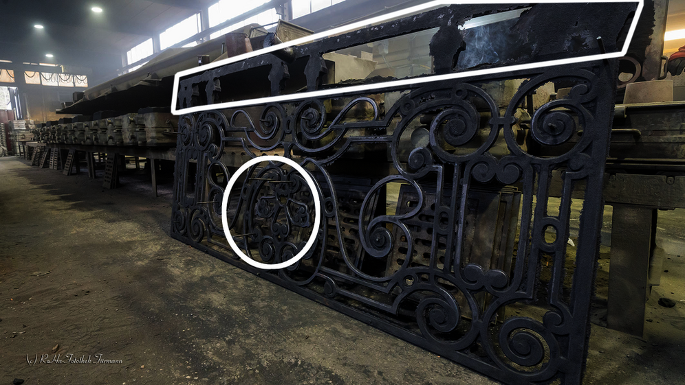 Nach einem Tag Abkühlung: Die Spannung steigt. „Ist der Guss gelungen?“ Über einem „Bett“ aus gebrochenem Formsand lässt ständiges, gefühlvolles Rütteln der am Flaschenzug hängenden Form den Sand langsam zerbrechen. Beim Anheben des Werkstückes dann die Erleichterung. Der Guss ist geglückt! „Wie Phoenix aus der Asche“ ersteht ein wunderbares Balkongeländer. Jetzt das Stück noch „entgraten“ – eine der mühsamten Arbeiten im Formguss: alles überschüssige Eisen schleifen und vor allem die kleinen zum Entweichen der Luft gebrauchten „Röhren“ abfräsen.