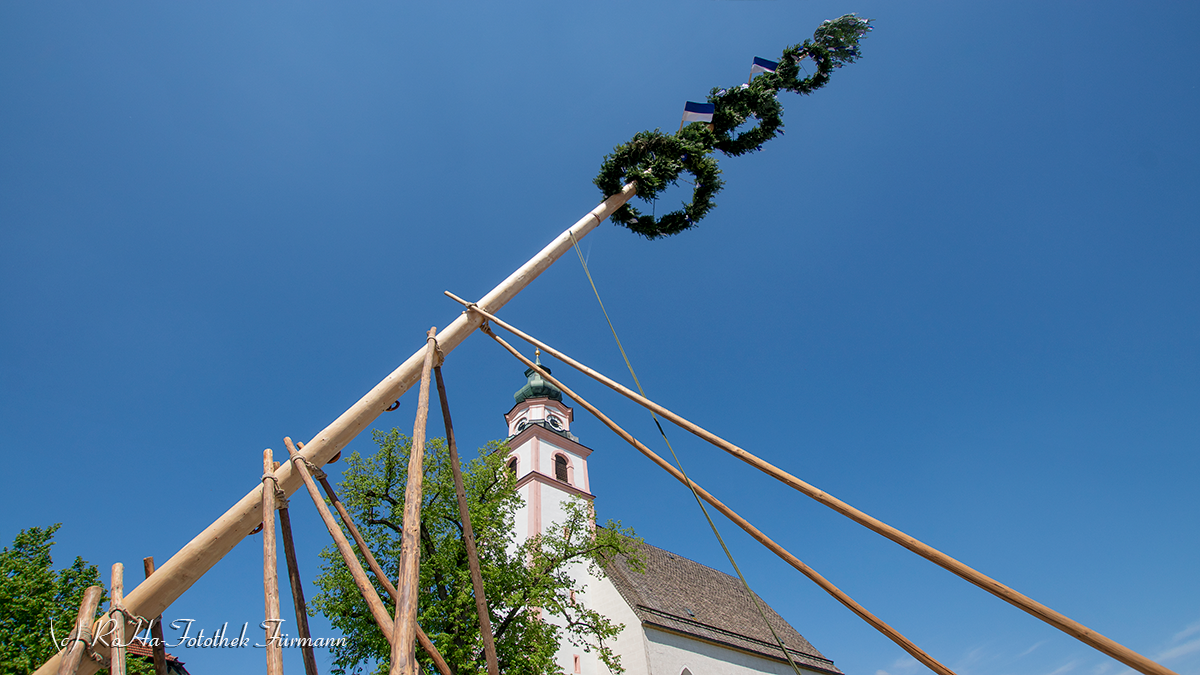 Mit viel Hauruck geht es in den Tagen rund um den 1. Mai für den Maibaum Zentimeter für Zentimeter nach oben, bis er in seiner vollen Länge in der Senkrechten steht. Schön geschmückt zeigt er sich mit den Zunftzeichen der ortsansässigen Handwerker, mit den Wappen der Gemeinde und Ortsteile.
